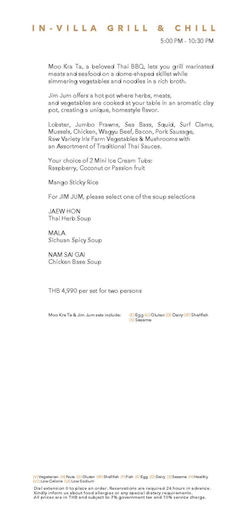 Watch as a personal chef and retinue of servers exquisitely prepare your dining choices 'in villa' to ensure